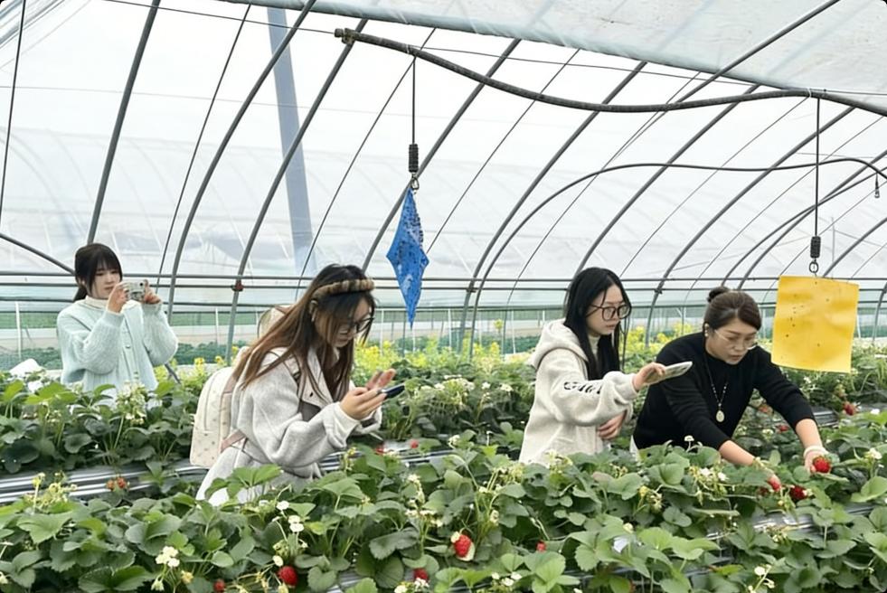 活动现场,农场负责人围绕红颜、黑珍珠等草莓品种,详细讲解了高架基质种植、水肥一体化管理等核心技术,以及绿色防控、生态种植的现代农业发展理念,结合农场获得的多项草莓品鉴金奖荣誉,分享了农产品品牌打造的经验。随后,成员们走进温室草莓园,近距离观察草莓生长状态,亲身参与采摘体验,在劳作中感受农耕乐趣与田园风光。
